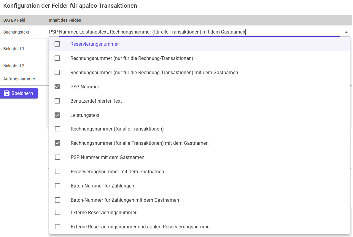 Im Sub Menü „Konfiguration der Datev Felder“ kann man definieren, welche Informationen in den Datev Feldern „Buchungstext“, „Belegfeld 1“ und "Belegfeld 2" und Auftragsnummer an Datev geschickt werden sollen. Die Standard-Einstellung ist: