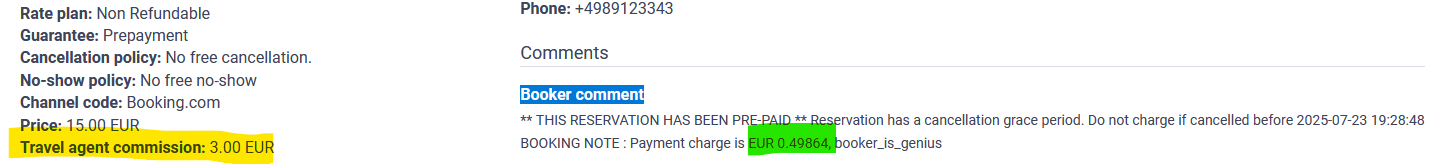 Die Gebühren von Booking.com werden als "Travel agent commission" und die Zahlungsgebühren aus dem "Kommentar des Buchenden (Booker comment)" ermittelt: