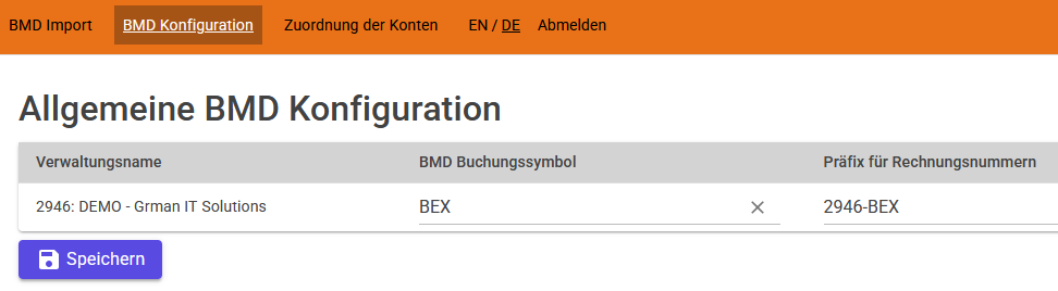 Im Menü „BMD-Konfiguration“ müssen Sie das BMD-Buchungssymbol und das Rechnungspräfix für jede Verwaltung definieren, für die eine BMD-Importdatei generiert werden soll.