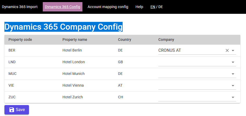 First, you must link the apaleo's hotels/properties to a Dynamics 365 company. You can do that in the menu "Dynamics 365 Config".