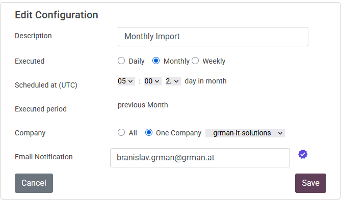 If the import is started monthly, then only the transactions from the last month can be imported. In this case, you define whether the import should run on the 1st, 2nd, 3rd, 4th or 5th day of the following month.