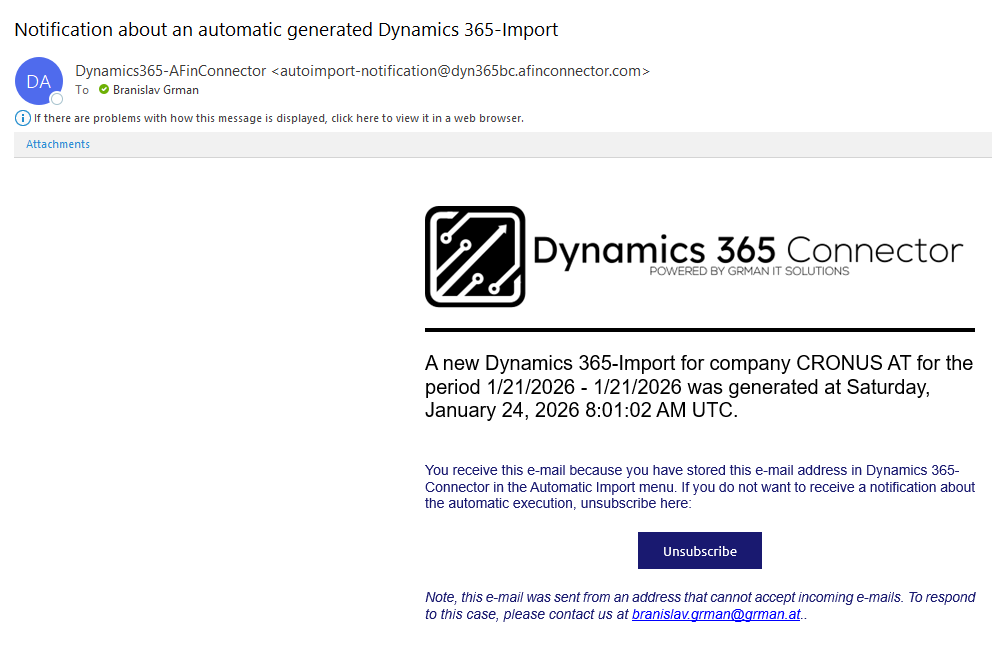 In the Automatic Import mask, you can configure automatic runs that periodically create Dynamics 365 imports. In the configuration you define whether this import should run daily, weekly or monthly.