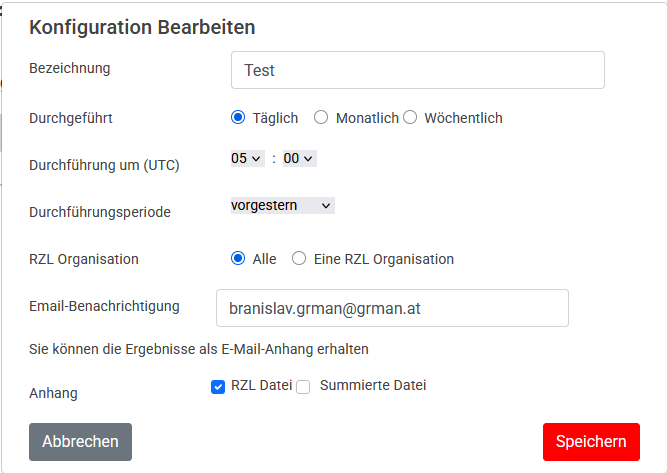 Die Konfiguration kann für eine RZL Organisation oder für alle RZL Organisationen definiert werden. Auch wenn die Konfiguration für alle RZL Organisationen eingestellt ist, werden die RZL-Dateien pro RZL Organisation erstellt.