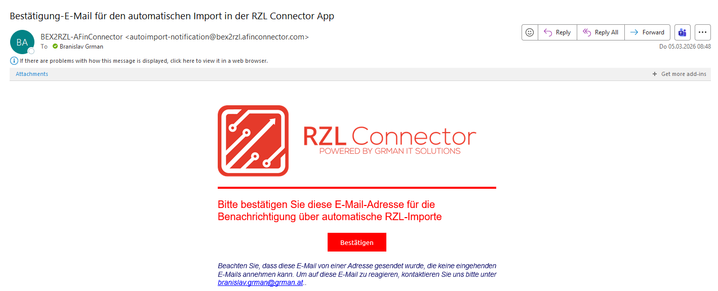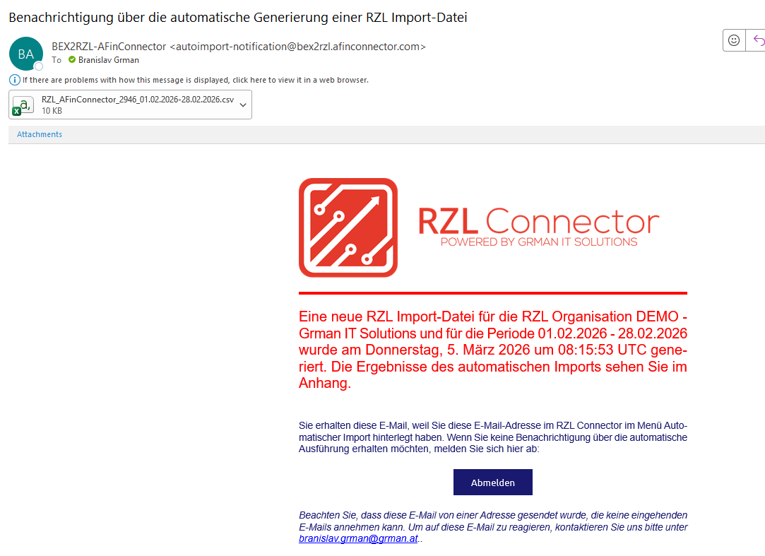 Die E-Mail-Adresse müssen Sie mit der Schaltfläche in der E-Mail bestätigen. Wenn die E-Mail-Adresse bestätigt ist (ein blaues Icon neben der E-Mail-Adresse) werden Sie nach jedem automatischen Import benachrichtigt. Wenn Sie die Checkboxen "RZL Datei" oder "Summierte Datei" beim Anhang in der Detail-Maske gesetzt haben, bekommen Sie diese Datei(en) in der Benachrichtigung-E-Mail als Anhang. So würde die E-Mail ungefähr aussehen: