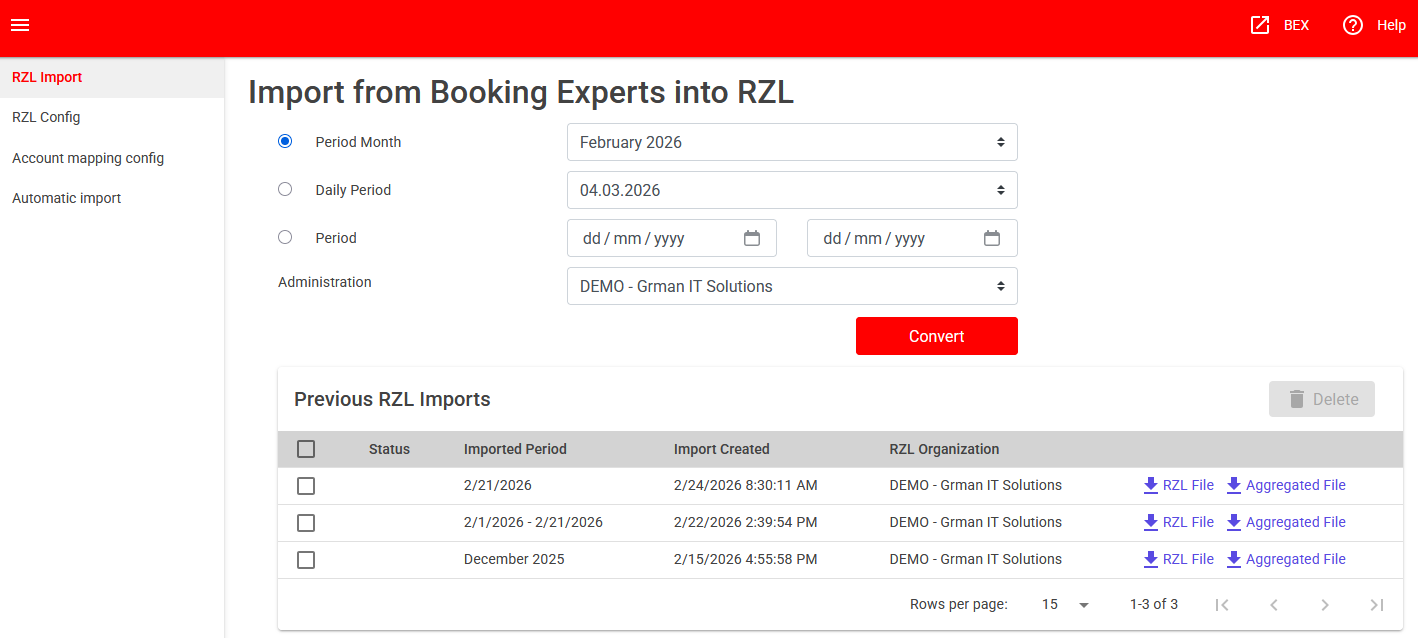 You can see the created import files in the list "Previous RZL Imports". If you click on the link "RZL File", the created file will be downloaded via Browser.